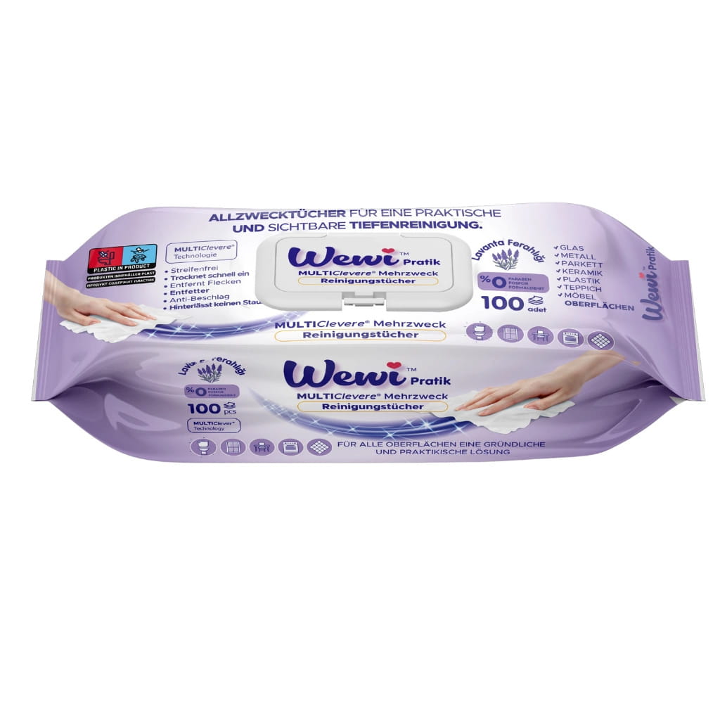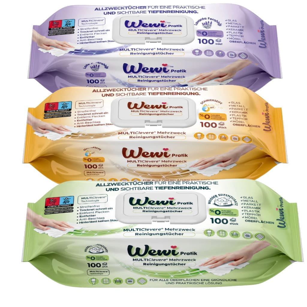 Wewi Pratik MULTIClever® to nowoczesne chusteczki wielozadaniowe, które skutecznie usuwają zabrudzenia, nie pozostawiając smug. Dzięki zawartości tradycyjnego białego mydła (Weißer Seifenzusatz) zapewniają wyjątkową świeżość, delikatność oraz przyjemny, klasyczny zapach czystości.