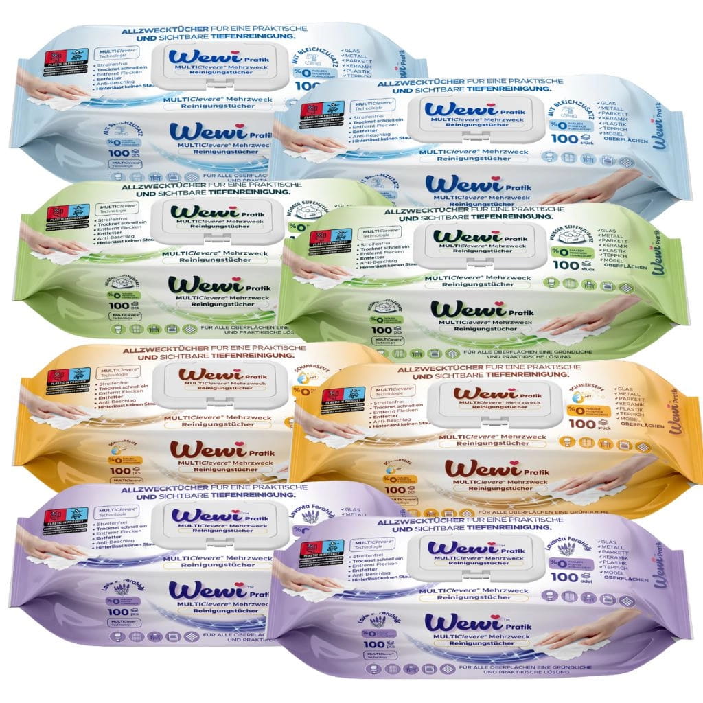 Wewi Pratik MULTIClever® to nowoczesne chusteczki wielozadaniowe, które skutecznie usuwają zabrudzenia, nie pozostawiając smug. Dzięki zawartości tradycyjnego białego mydła (Weißer Seifenzusatz) zapewniają wyjątkową świeżość, delikatność oraz przyjemny, klasyczny zapach czystości.