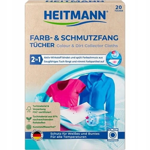Heitmann Farb & Schmutz Fangtucher podczas prania chusteczki działają w wodzie jak magnes przyciągając barwnik, mydliny i brud unoszące się w wodzie. Dzięki temu prane ubrania nie ulegają przypadkowemu zabarwieniu a ich kolory pozostają niezmienione. Już 1 chusteczka wystarczająco skutecznie wyłapuje barwnik, co pozwala prać razem ubrania o różnych kolorach oraz jaśniejsze z ciemniejszymi. Opakowanie zawiera 20 chusteczek.