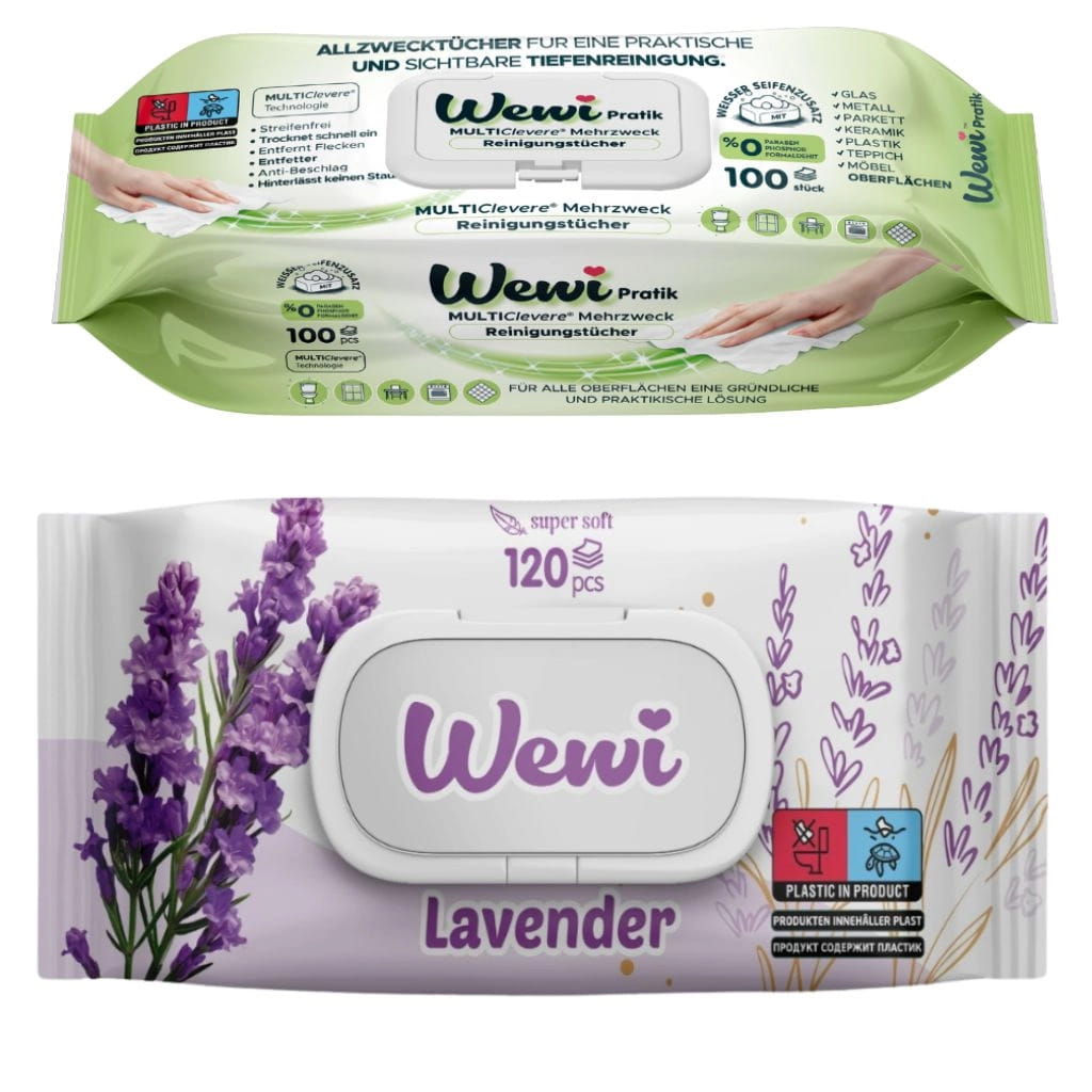 Wewi Pratik MULTIClever® to nowoczesne chusteczki wielozadaniowe, które skutecznie usuwają zabrudzenia, nie pozostawiając smug. Dzięki zawartości tradycyjnego białego mydła (Weißer Seifenzusatz) zapewniają wyjątkową świeżość, delikatność oraz przyjemny, klasyczny zapach czystości.