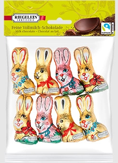 Riegelein- mini zajączki z mlecznej czekolady. Idealny dodatek do wielkanocnego koszyczka. W opakowaniu znajduje się 8 zajączków. Waga: 100g