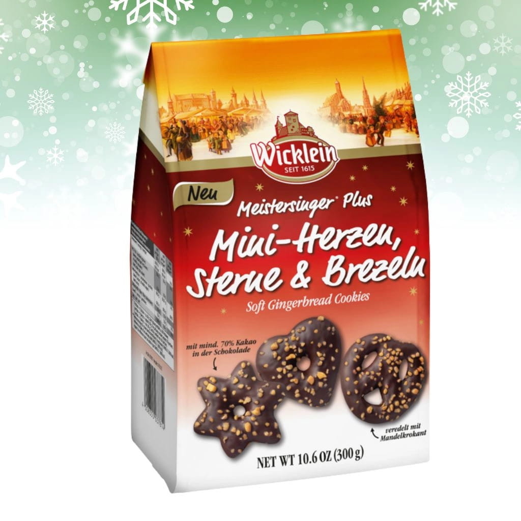 Wicklein Meistersinger Plus Mini-Herzen, Sterne & Brezeln to wyjątkowe miękkie pierniczki norymberskie, będące połączeniem ponad 400-letniej tradycji niemieckiego cukiernictwa i nowoczesnych receptur. Pierniki w kształcie serduszek, gwiazdek i precli zachwycają nie tylko wyglądem, ale przede wszystkim intensywnym, korzennym aromatem.